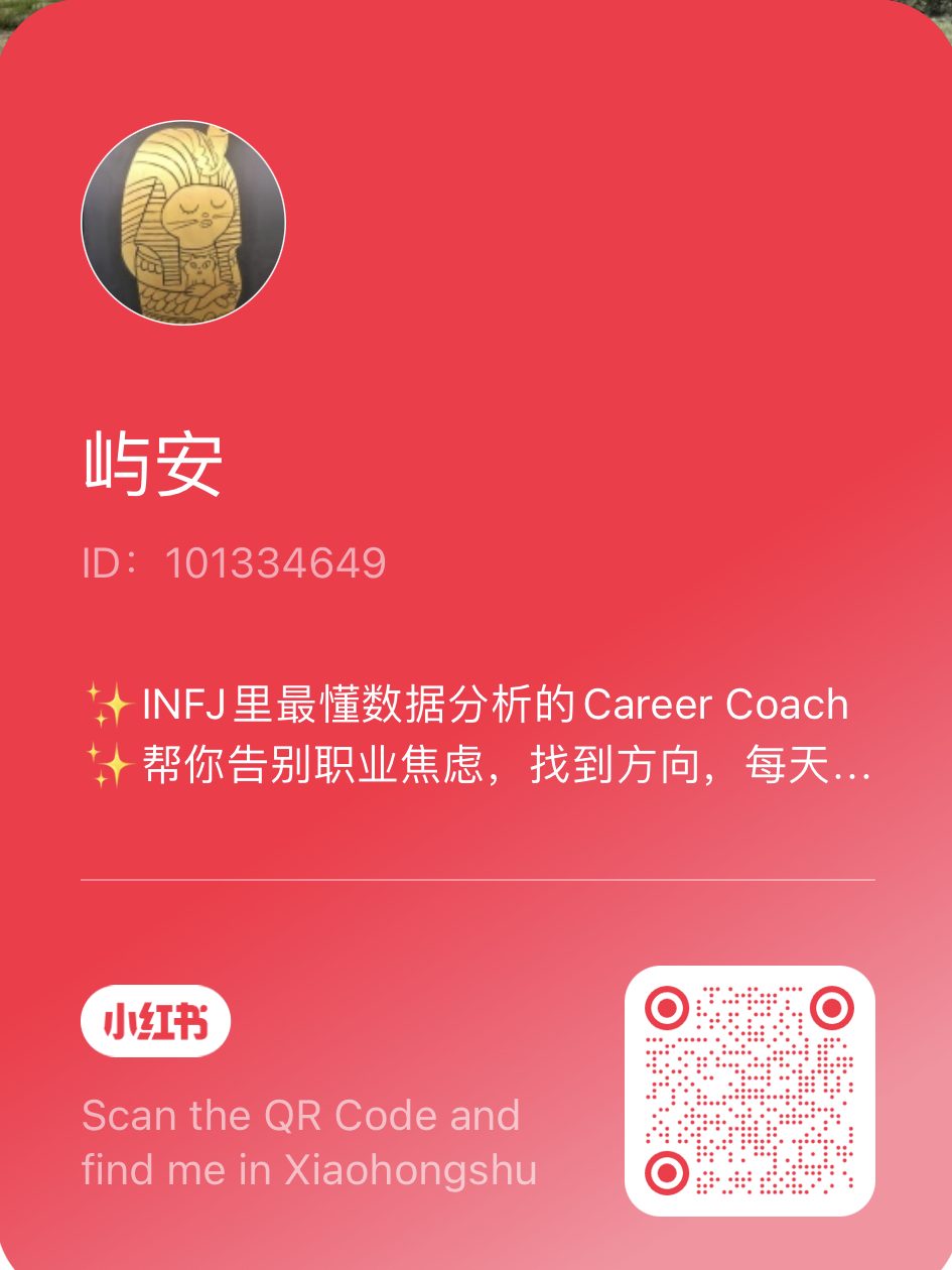 Hi, 我是An,坐标美西,是一名Career Coach。经过一年多的思考和试水,2022年底我主动辞去了大厂工作,专注于探索Coaching:边做Career Coaching的同时,边系统性学习Somatic Coaching(目前已毕业)。辞职做Coaching之前,我在Netflix做分析工程师(Analytics Engineer)。我对探索人类的Well-Being的Flourishing有巨大热情。能通过倾听和Coaching、帮助他人找到更好的状态,并且能从中更深刻地感受到“人类共同体”这个体验,是一件特别幸福的事。闲暇的时候,我喜欢做瑜伽,散步,看书,听podcast,尝试新的东西(动手 > 动脑的)。2020年底我们迎来了一个宝宝,我也变成了一个母亲,正在享受这个过程中的酸甜苦辣。